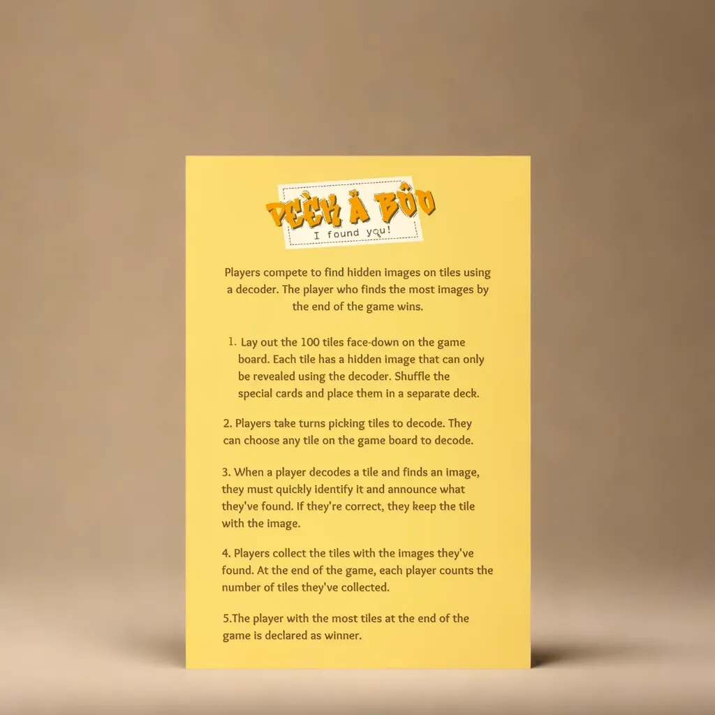 Peekaboo features a game board filled with 100 hidden pictures. Players use the included decoder glass to uncover these hidden images. Special cards add exciting twists and challenges, keeping everyone on their toes. The player who finds the most pictures by the end of the game wins!